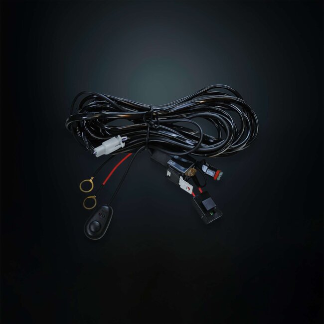 12V cable kit with ON/OFF button adapted for most vehicles. The cable kit can be used by an LED bar with a maximum consumption of 145W with a DT connector and 360W if the DT connector is cut off. The cable kit includes 30A hanging fuse, a 40A relay, and cables ((1,5mm_) with a DT2 connector. If you don«t want to use the ON/OFF button and would rather take control of current from, for example, the vehicle«s light beam, the blue cable on the cable kit can be used. For use with 24 V, you need a separate relay.